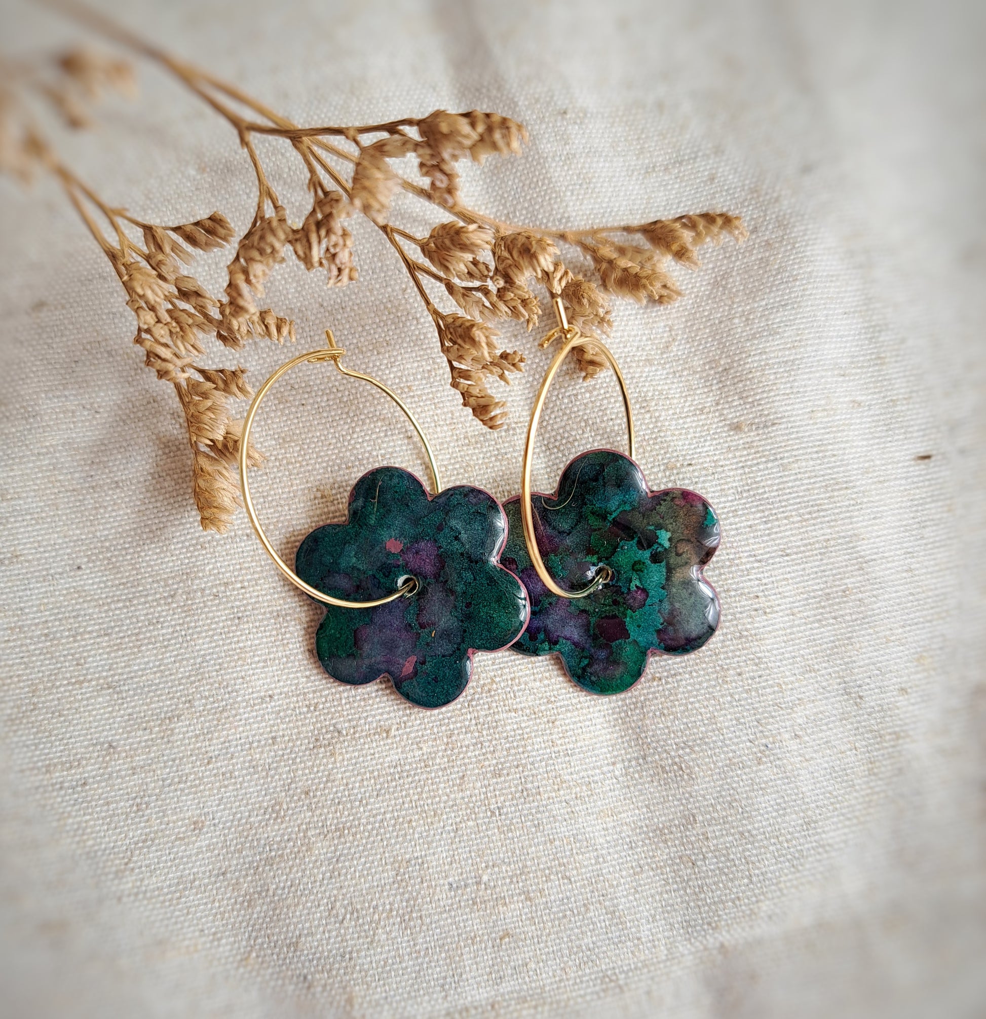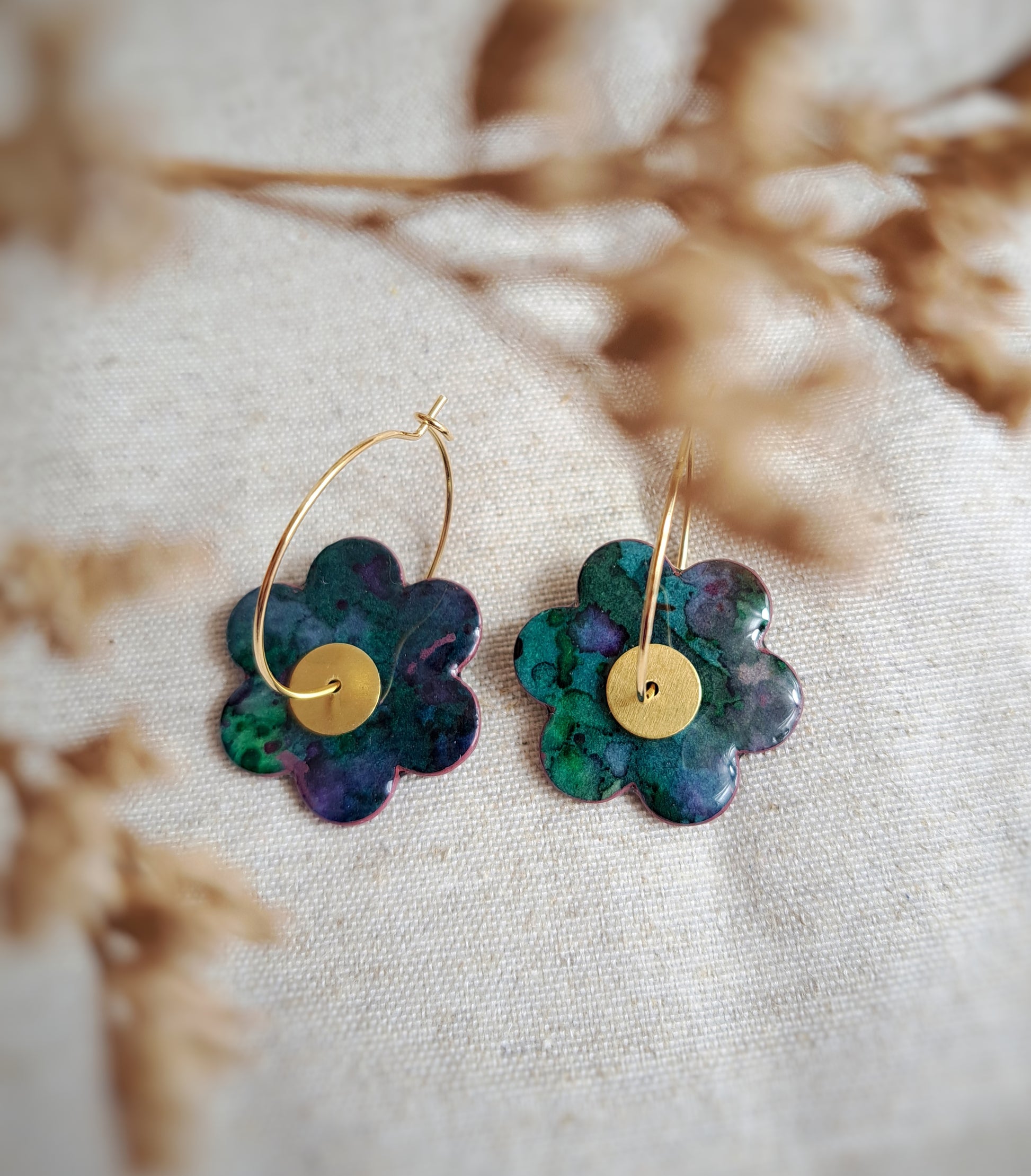 Créoles fleurs "SIMPLY II" vert, émeraude, bordeaux - aquarelle - plaqué or 18k
