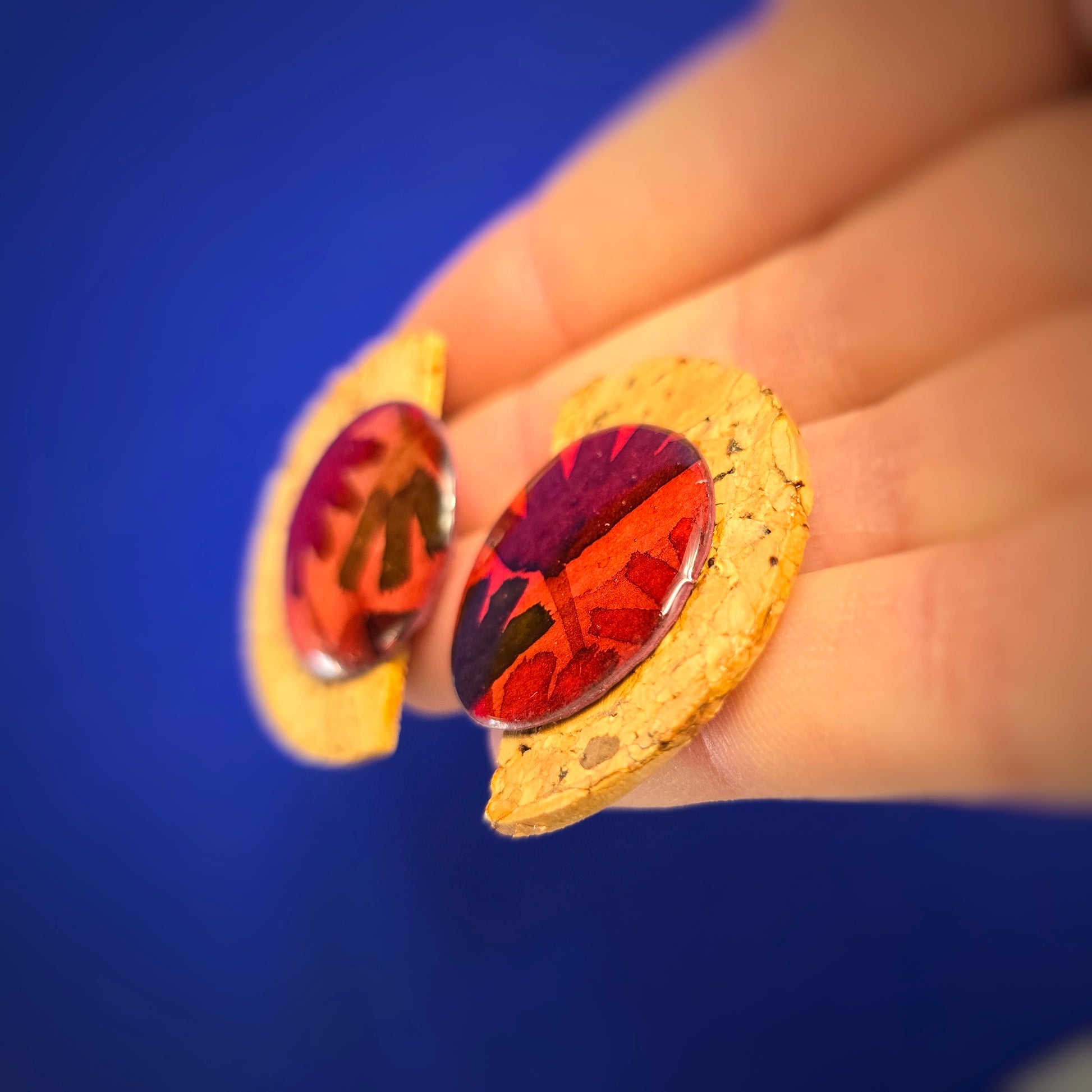 Puces d'oreilles "Empreinte" rouge- Aquarelle & liège